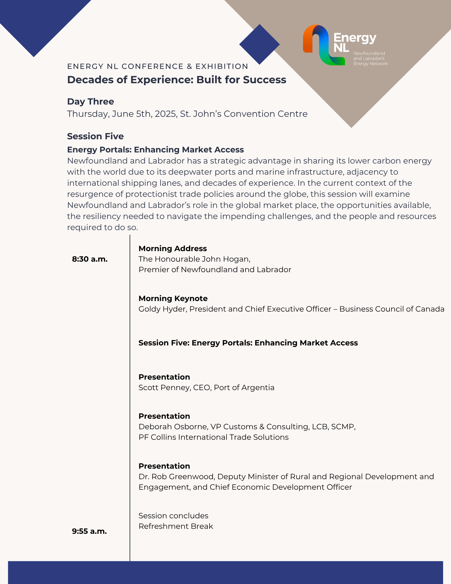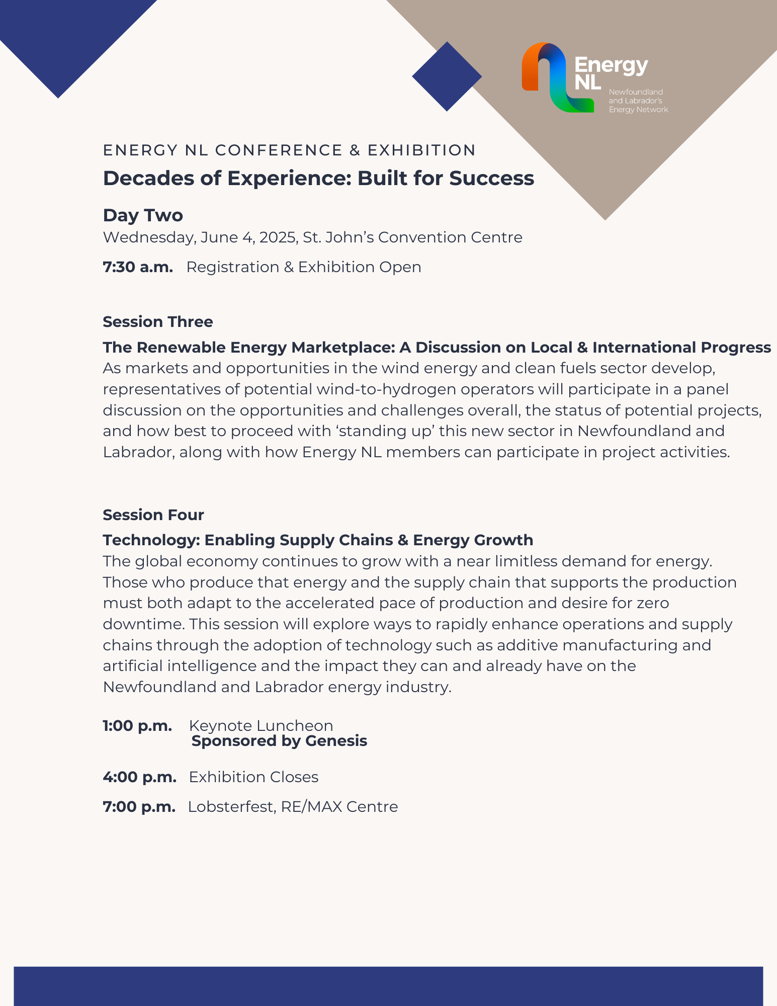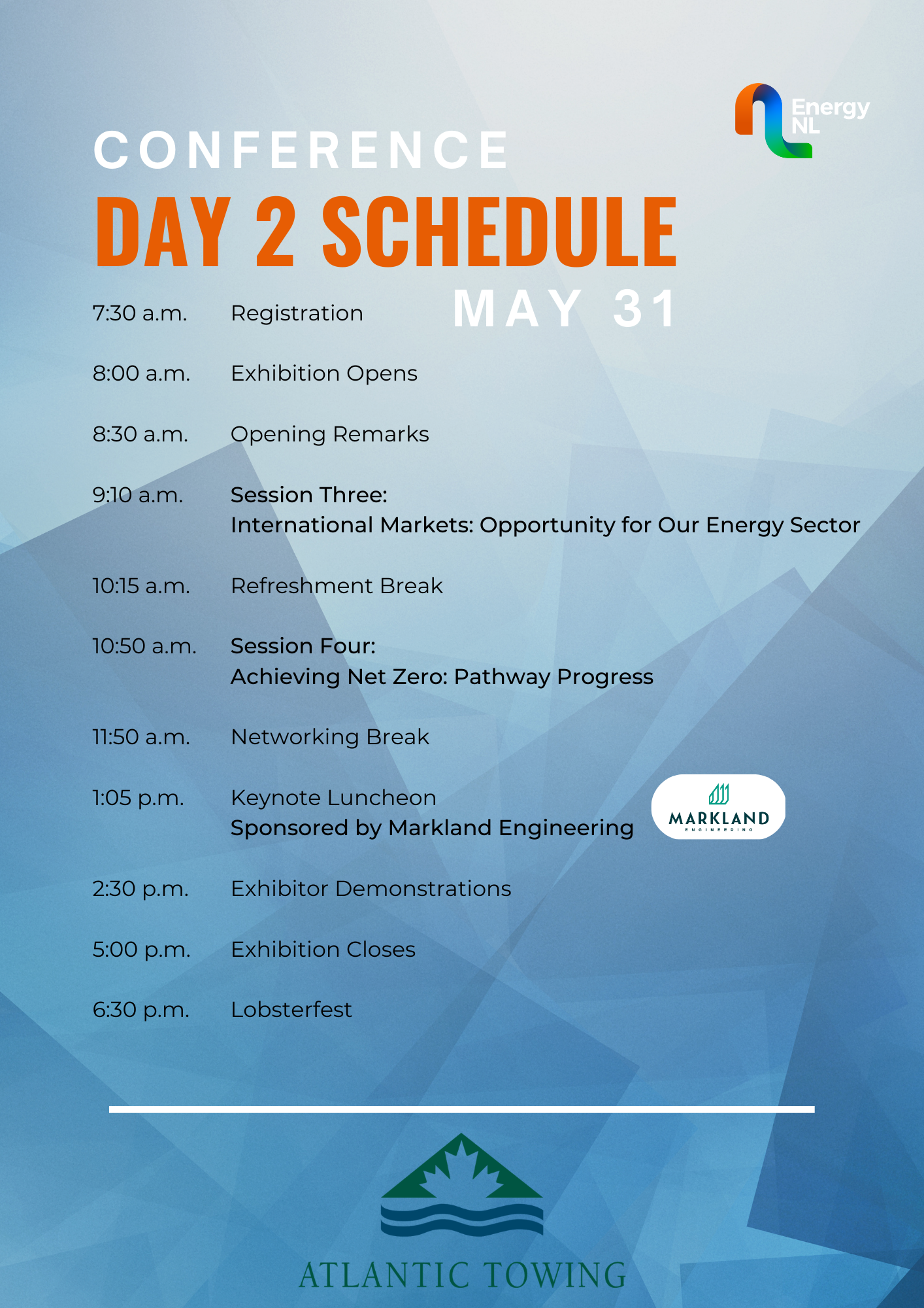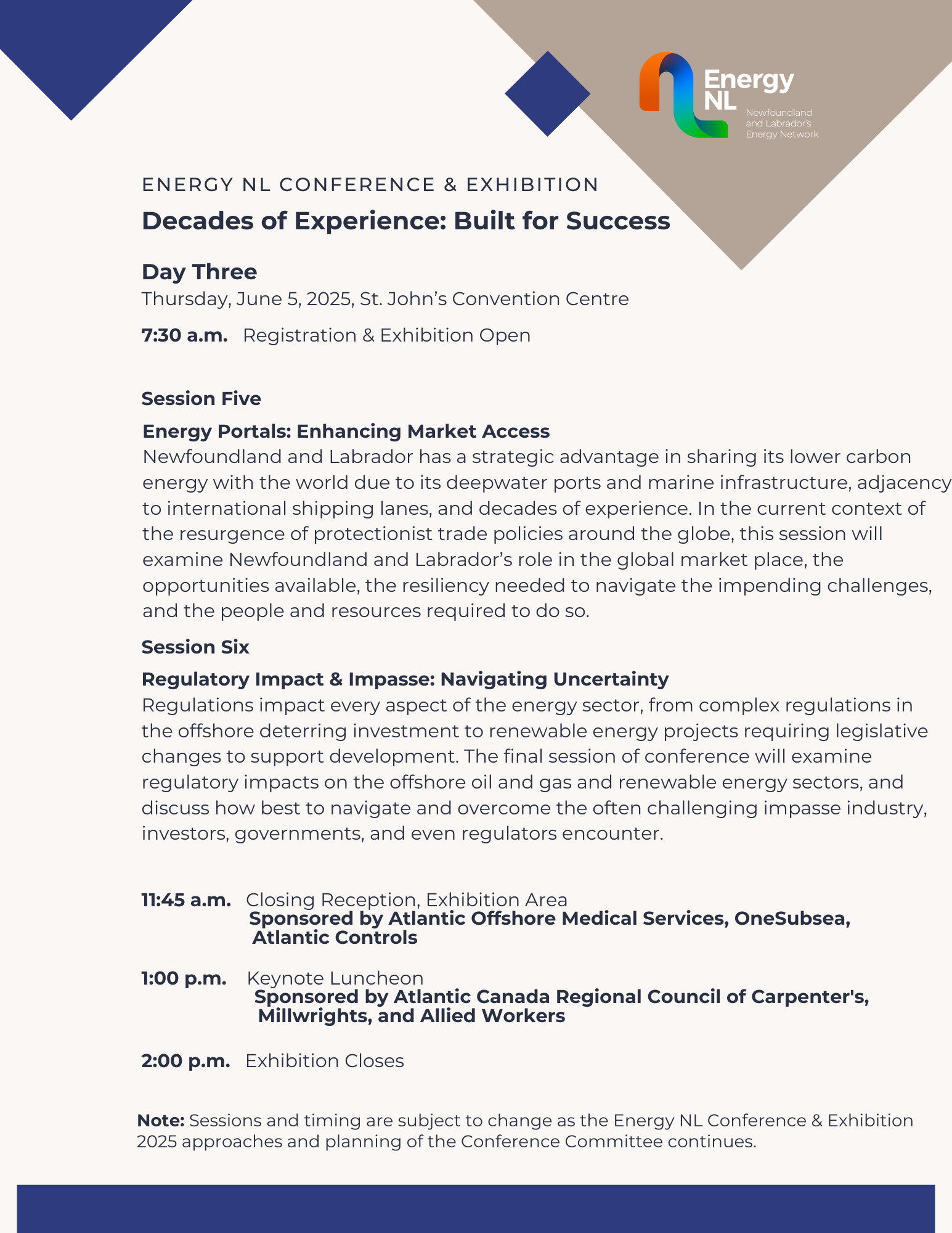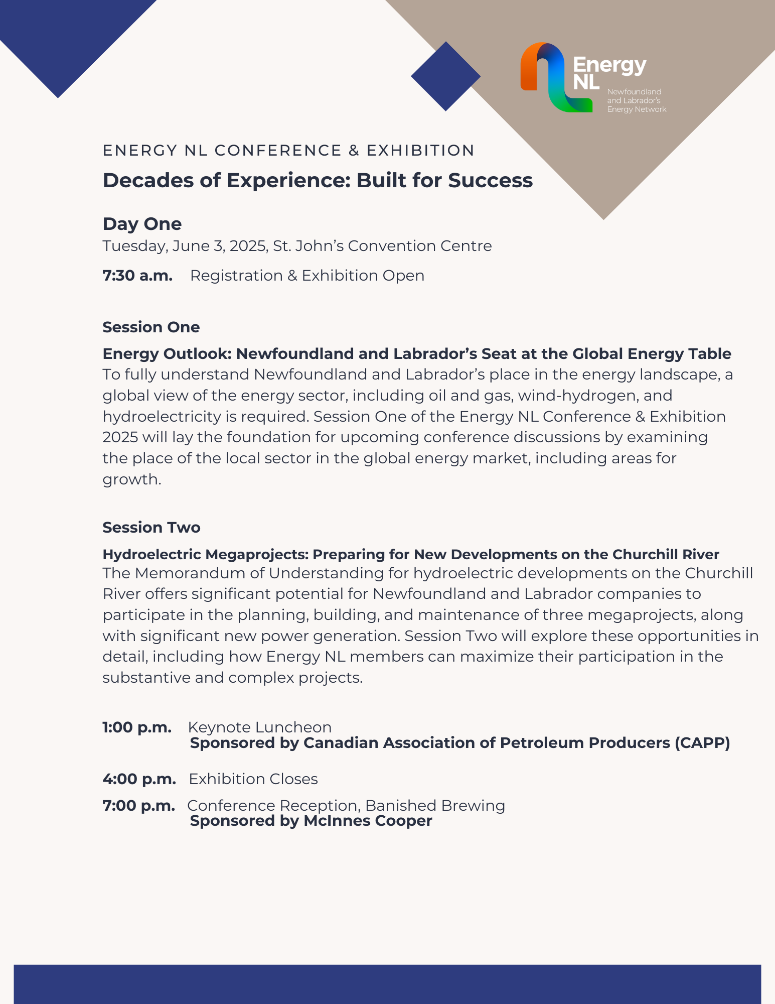 Let your network know that you will be participating in Energy NL's Conference & Exhibition 2025! Whether you are an attendee, speaker, or exhibitor, use the social media tools below to share information about Energy NL's Conference & Exhibition 2025 with your colleagues – let the industry know you are ready to connect in-person in St. Johns! Make sure you are following Energy NL on your favorite social platforms and tag us in your posts: Use the following hashtags in your posts so that the Network can find them and share: Download here Download here Download here Hotels & Rates Delta Hotels St. John's Conference Centre & Sheraton Hotel Newfoundland Monastery Hotel Leaside Manor Doubletree by Hilton St. John’s Harbourview Alt Hotel St. John's Share Your Participation