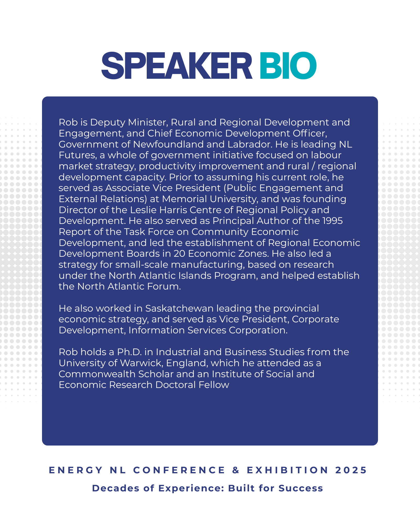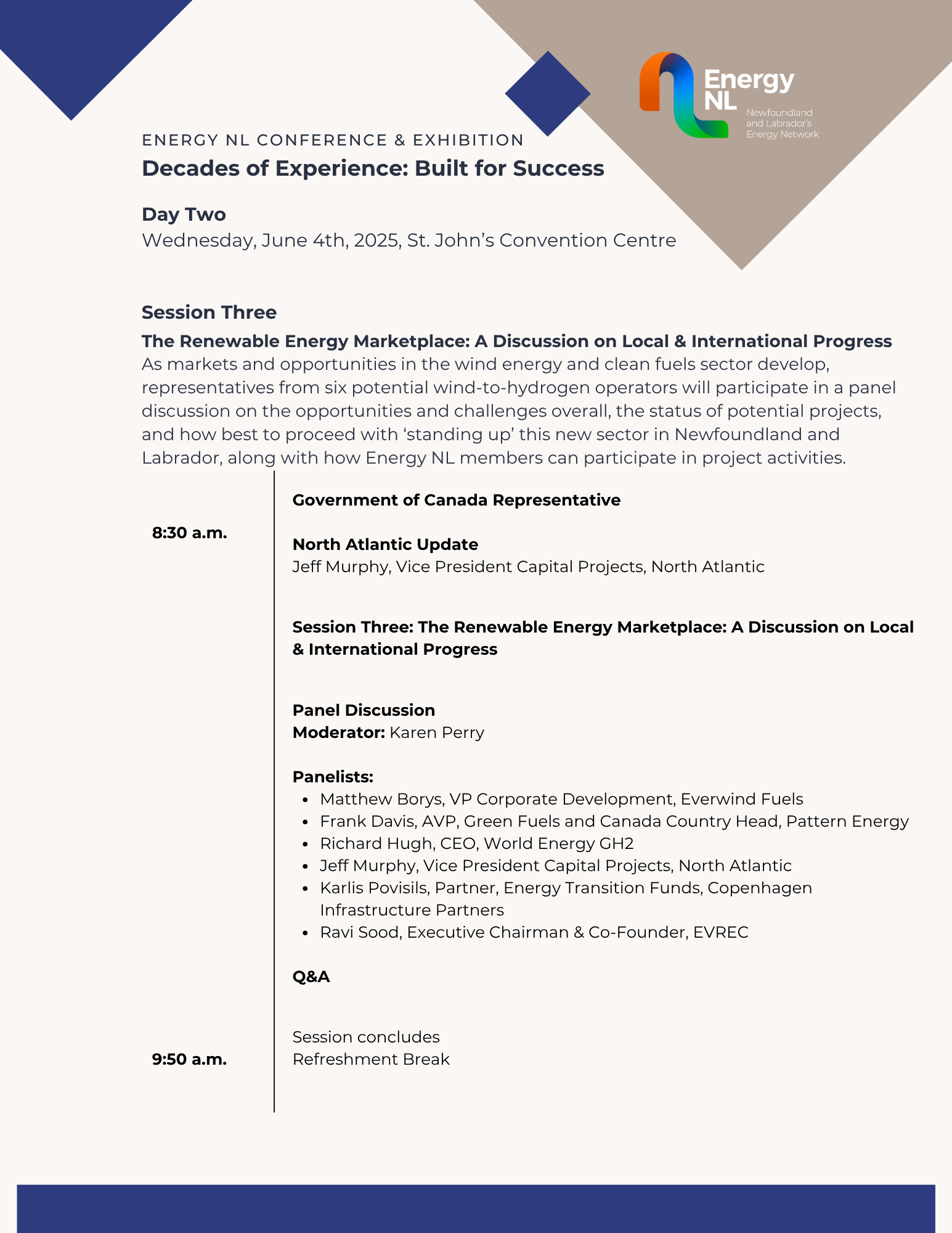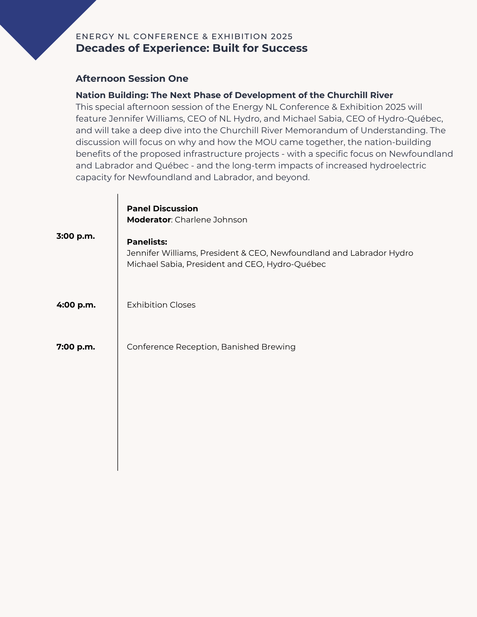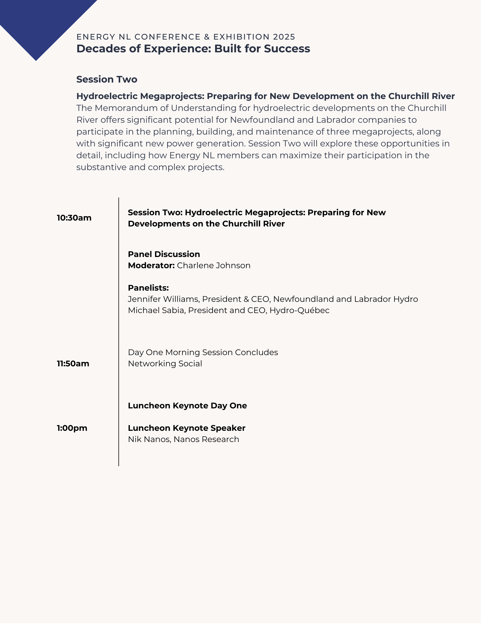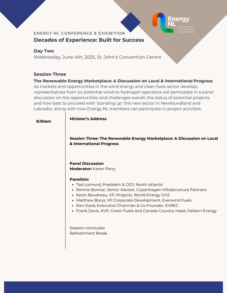 Let your network know that you will be participating in Energy NL's Conference & Exhibition 2025! Whether you are an attendee, speaker, or exhibitor, use the social media tools below to share information about Energy NL's Conference & Exhibition 2025 with your colleagues – let the industry know you are ready to connect in-person in St. Johns! Make sure you are following Energy NL on your favorite social platforms and tag us in your posts: Use the following hashtags in your posts so that the Network can find them and share: Download here Download here Download here Hotels & Rates Delta Hotels St. John's Conference Centre & Sheraton Hotel Newfoundland Monastery Hotel Leaside Manor Doubletree by Hilton St. John’s Harbourview Alt Hotel St. John's Share Your Participation