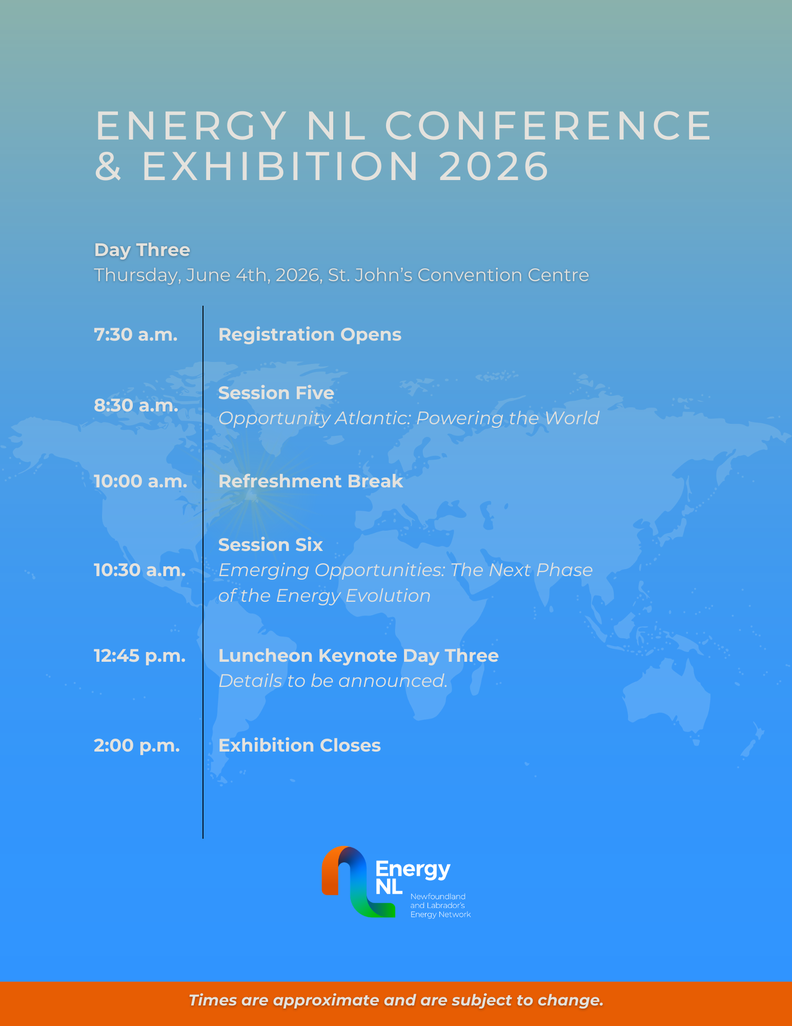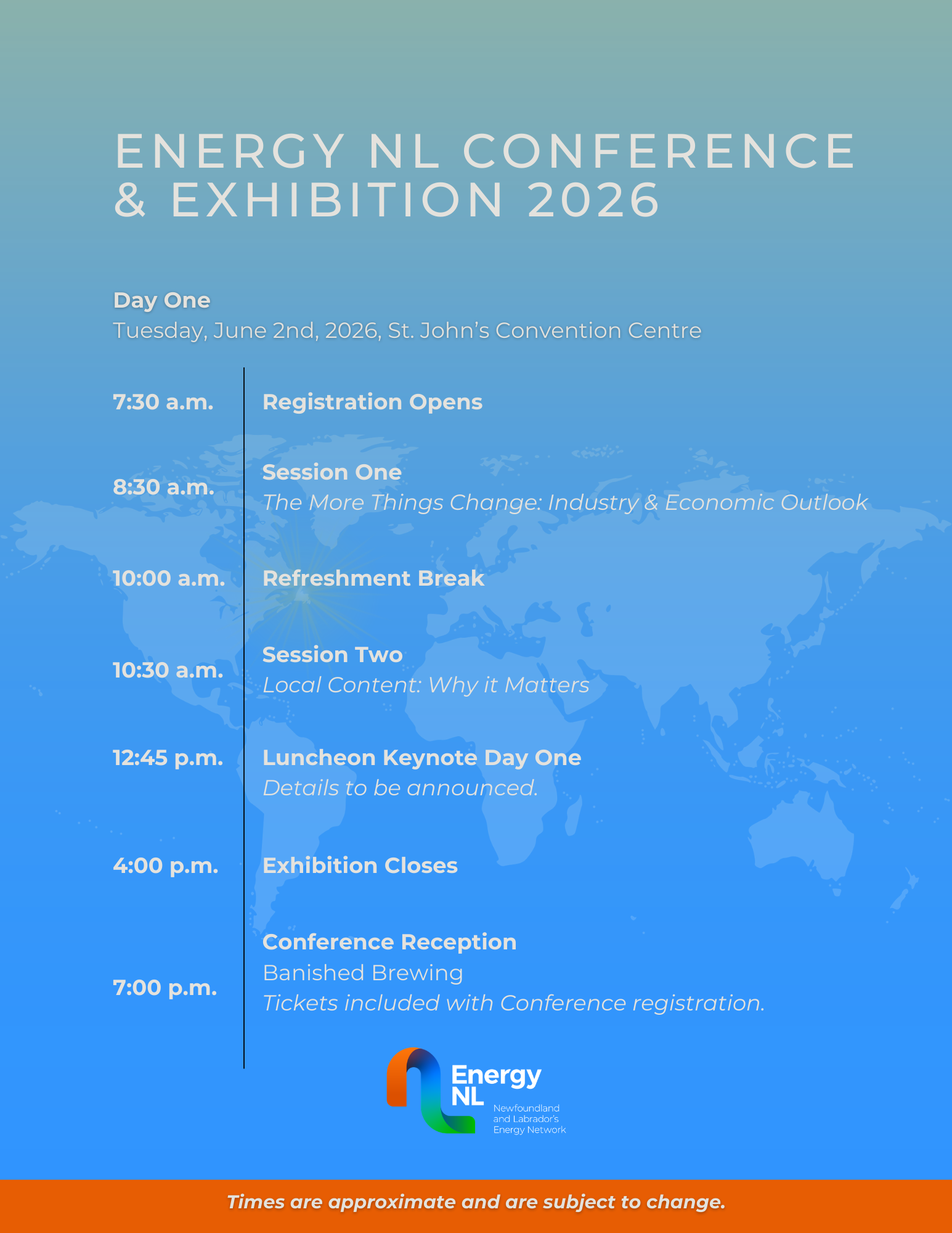 Member pricing for full registration: Lobsterfest tickets are available for separate purchase with your full conference registration (while quantities last). The Energy NL Conference & Exhibition 2026 is taking place from June 2-4, 2026, at the St. John's Convention Centre. Further details are coming soon. The More Things Change: Industry & Economic Outlook Details coming soon. Local Content: Why it Matters Details coming soon. Details coming soon. Details coming soon. Regulatory Review: Legislative Approaches Working for You Details coming soon. The Path from Engagement to Inclusion: Indigenous Success Stories Details coming soon. Details coming soon. Details coming soon. Opportunity Atlantic: Powering the World Details coming soon. Emerging Opportunities: The Next Phase of the Energy Evolution Details coming soon. Details coming soon. Details coming soon. Details coming soon. Silver Sponsors To be announced. Closing Reception Sponsors To be announced. Let your network know that you will be participating in Energy NL's Conference & Exhibition 2026! Whether you are an attendee, speaker, or exhibitor, share information about Energy NL's Conference & Exhibition 2026 with your colleagues – let the industry know you are ready to connect in-person in St. Johns! Make sure you are following Energy NL on your favorite social platforms and tag us in your posts: Use the following hashtags in your posts so that the Network can find them and share: Hotels & Rates Alt Hotel - 2026 Corporate Rates Delta St. John's Hotel & Conference Centre, Westmont Hospitality - $239.00 per room per night. Subject to availability at time of booking. Please see website here. Leaside Manor or Monastery Spa Hotel - $209 per night (Breakfast included). For Leaside Manor click here. For Monastery Spa Hotel, please click here Doubletree by Hilton St. John's Harbourview - Doubletree by Hilton St. John’s Harbourview is offering a special rate . Click here to view Registration